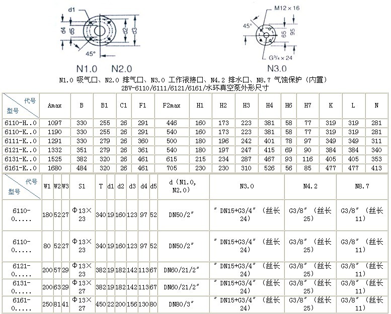 2BV系列水環真空泵适于抽除氣體和濕潤蒸汽,吸氣壓力可達到33mbar絕壓(97%真空度),當2BV水環式真空泵在吸氣壓力低于80mbar的狀态下長期工作時,應聯接汽蝕保護管以對泵進行保護,2BV水環式真空泵如配大氣噴射器吸氣壓力可達10mbar,噴射器可直接安裝在真空泵吸氣口上,作爲壓縮機使用時,其壓力最大至0.26MPa(絕壓)。