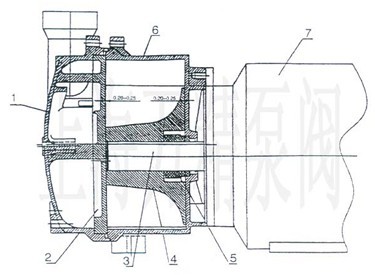 | 1.泵蓋 2.園盤 3.平鍵 4.葉輪 5.機械密封 6.泵體 7.電動機 |