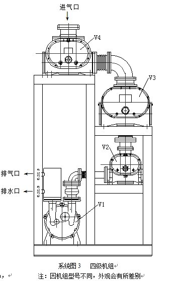 該機組的主泵爲V4型羅茨真空泵,由V3、V2型羅茨真空泵和V1型液環真空泵作爲前級泵(如系統圖3),爲保證各泵的正常運轉,應按以下程序操作: