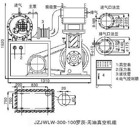 1、JZJWLW型無油立式真空機組采用無油潤滑和無油密封技術,與羅茨泵組成機組能獲得150Pa,25Pa,1Pa以内高真空。