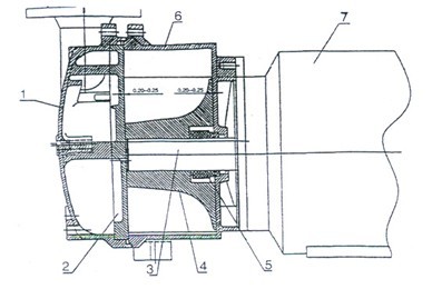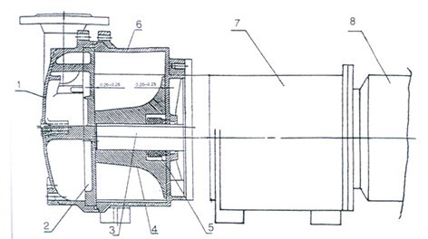 | 1.泵蓋 2.園盤 3.平鍵 4.葉輪 5.機械密封 6.泵體 7.電動機 |