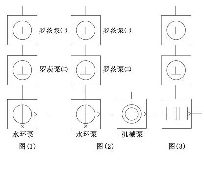 (3)如果三級羅茨水環機組還不能滿足極限壓力時,可采用羅茨泵-水環泵并聯機械真空泵;此機組主要用于需要處理大量水蒸汽,時間長且極限真空度要求非常高的抽真空系統,例如在真空幹燥方面。