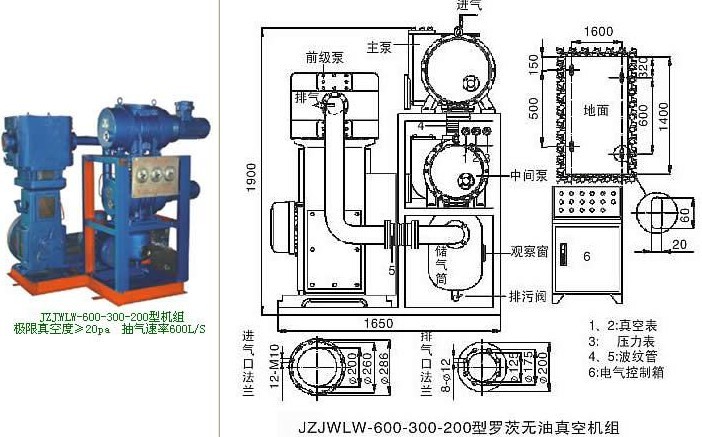 1、JZJWLW型無油立式真空機組采用無油潤滑和無油密封技術,與羅茨泵組成機組能獲得150Pa,25Pa,1Pa以内高真空。